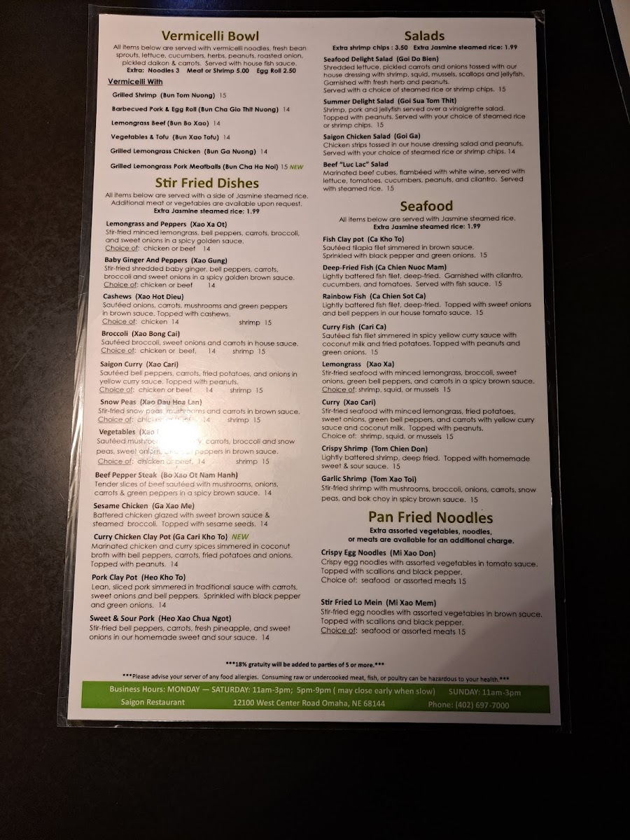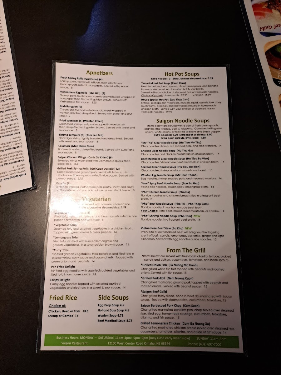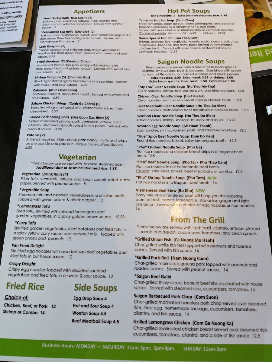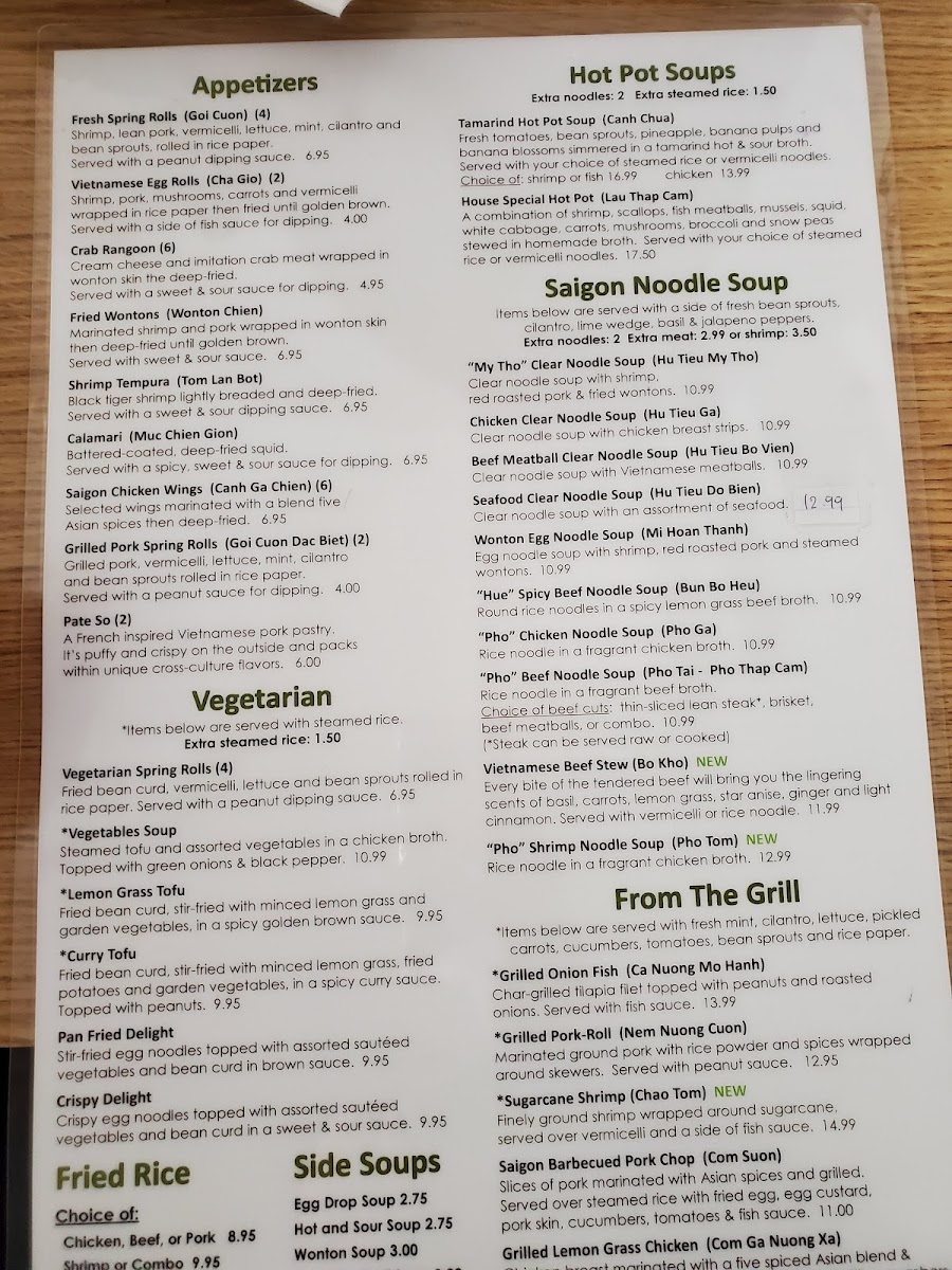 The menu at Saigon Restaurant offers a variety of traditional Vietnamese dishes along with a selection of beverages. It is organized into several categories to cater to different tastes and dining needs.