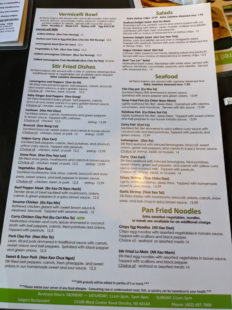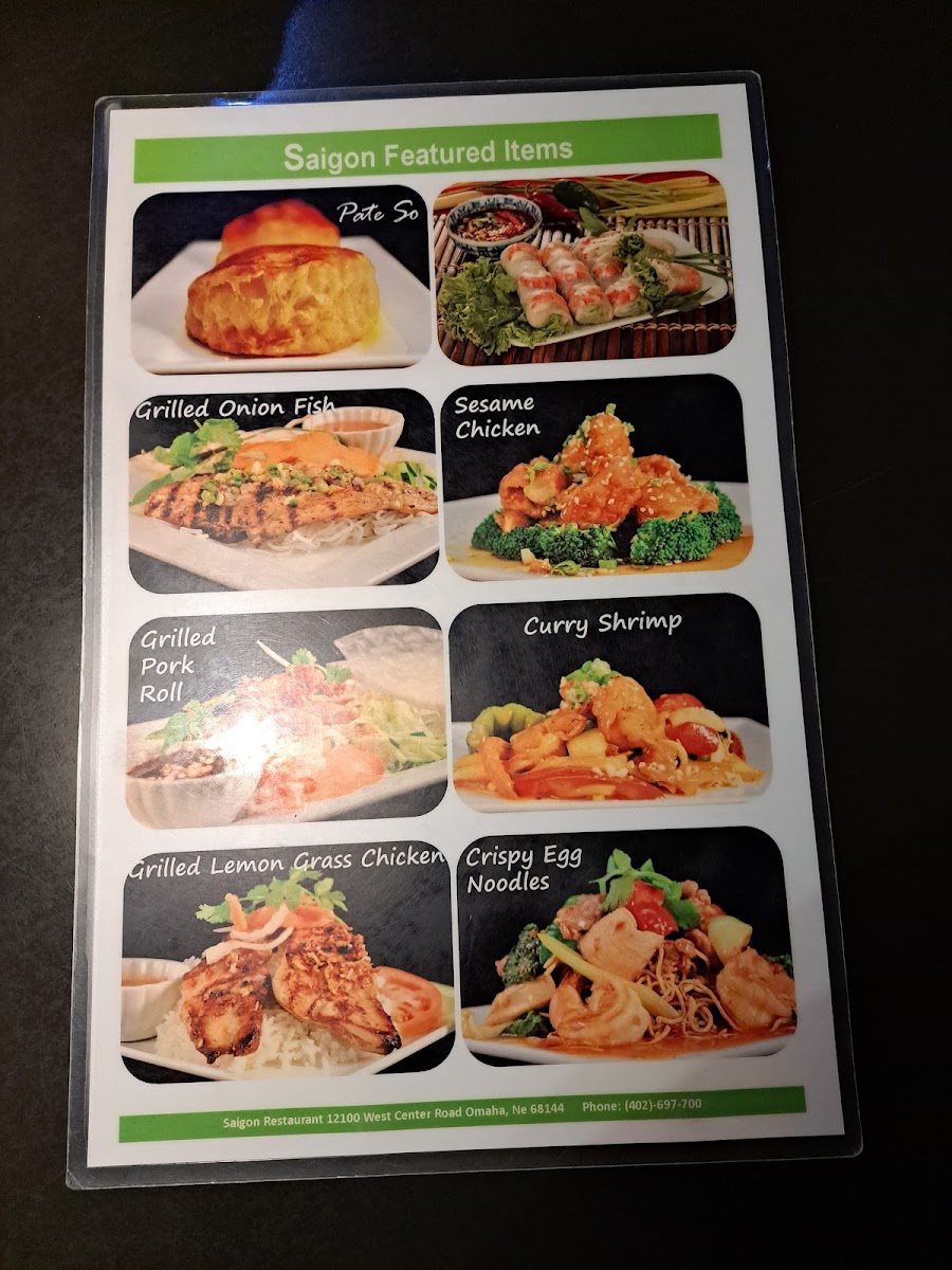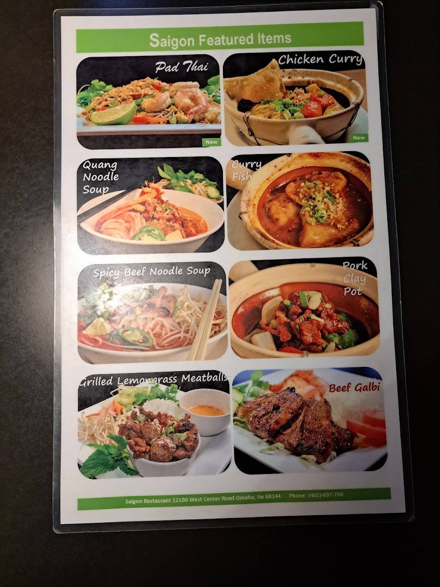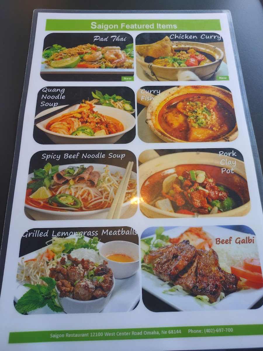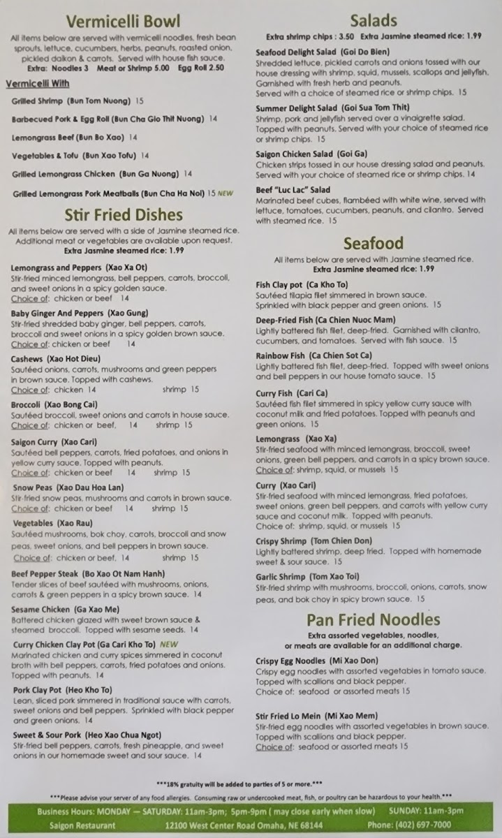The menu at Saigon Restaurant offers a variety of traditional Vietnamese dishes along with a selection of beverages. It is organized into several categories to cater to different tastes and dining needs.